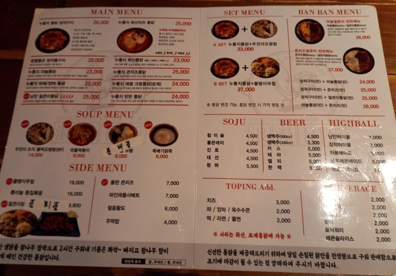 서면 낭만장작 메뉴판입니다.