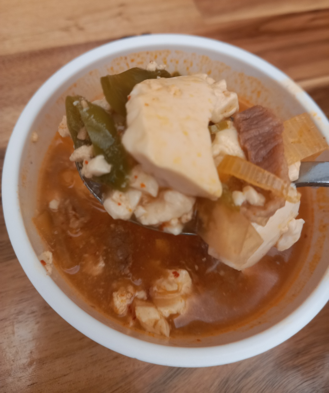 구수한 된장국맛에 두부와 고기가 정말 많이 들어 있습니다.