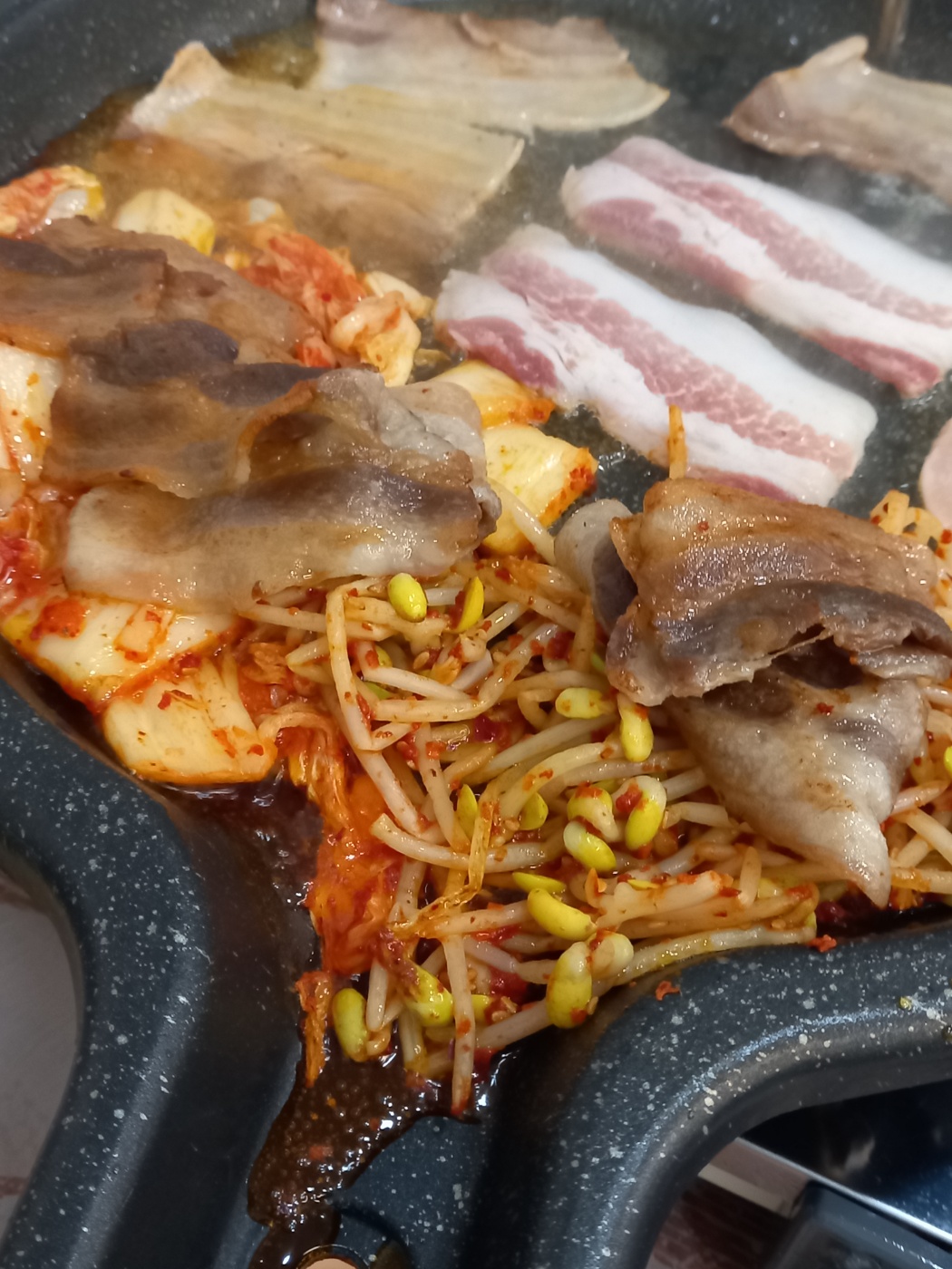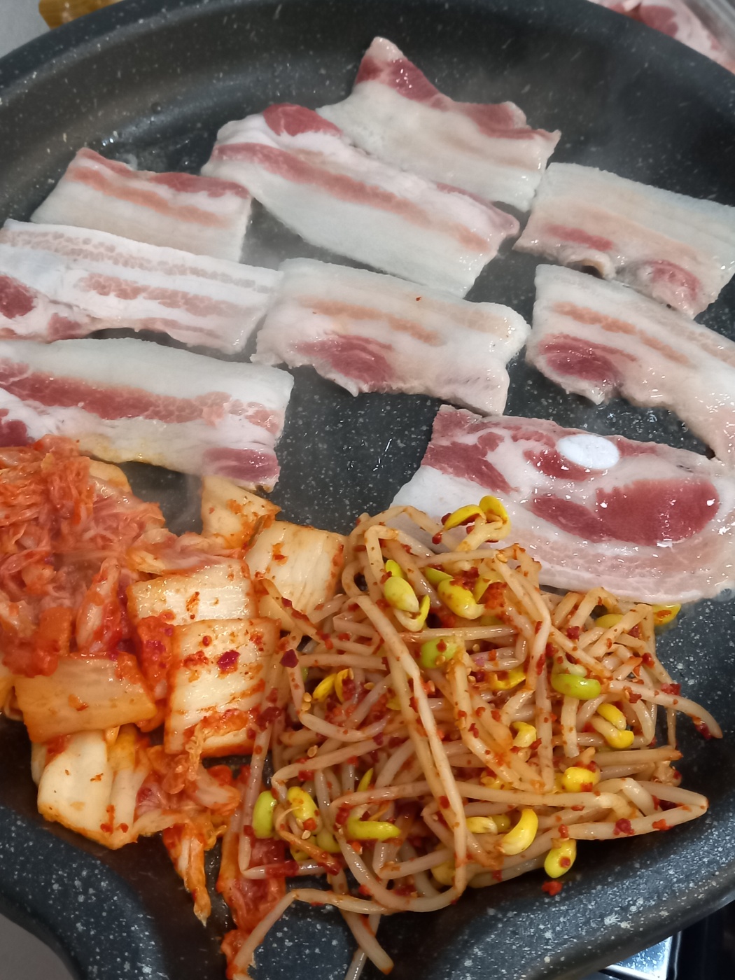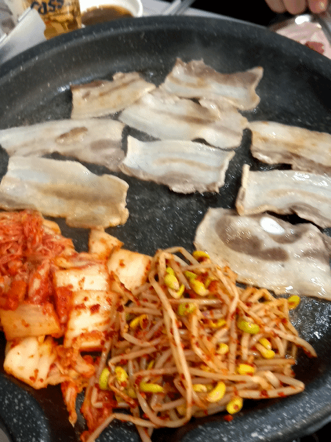 급냉삼겹살과 김치 콩나물을 불판에 올려줍니다.