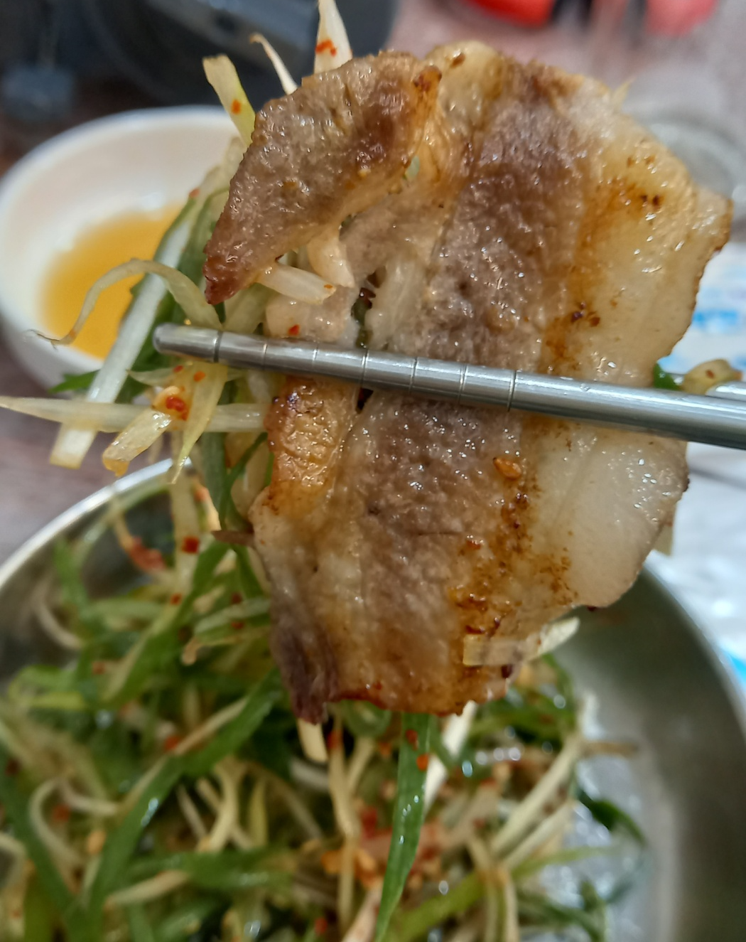 급냉삼겹살이 고소한맛이 좋은데 기름소스에 찍어드시면 더욱 고소한맛이 좋습니다.
