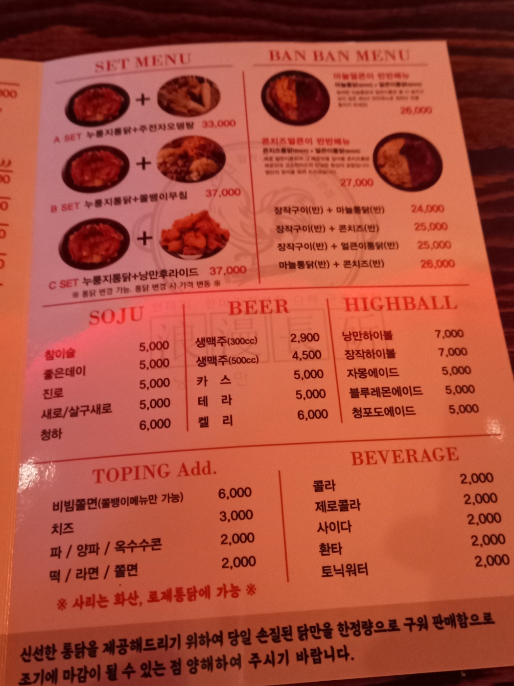 누룽지 통닭 장작구이 콘치즈통닭 낭만얼큰이통닭등 여러 통닭 메뉴를 판매합니다.