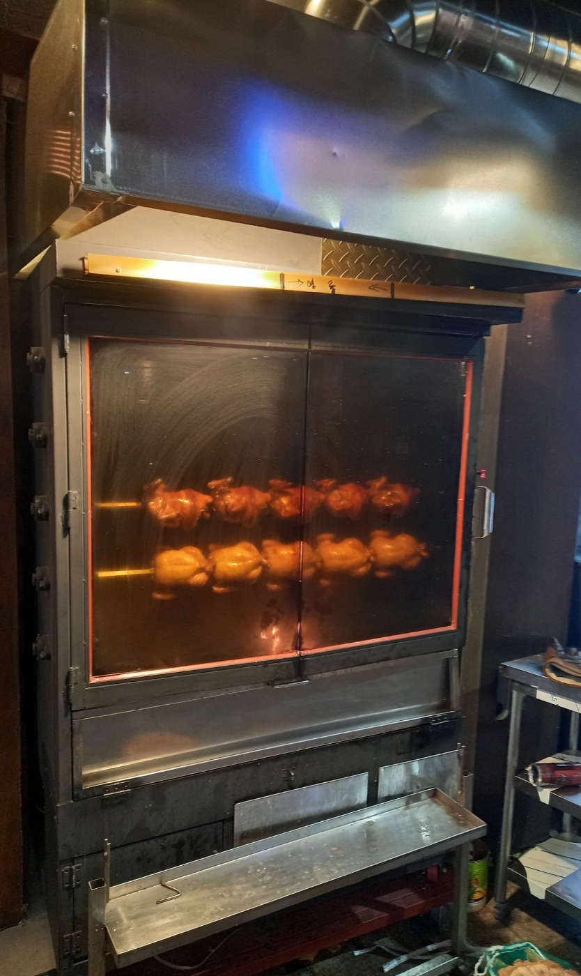 가게 밖 화로에서 맛있게 구워지는 통닭입니다.
