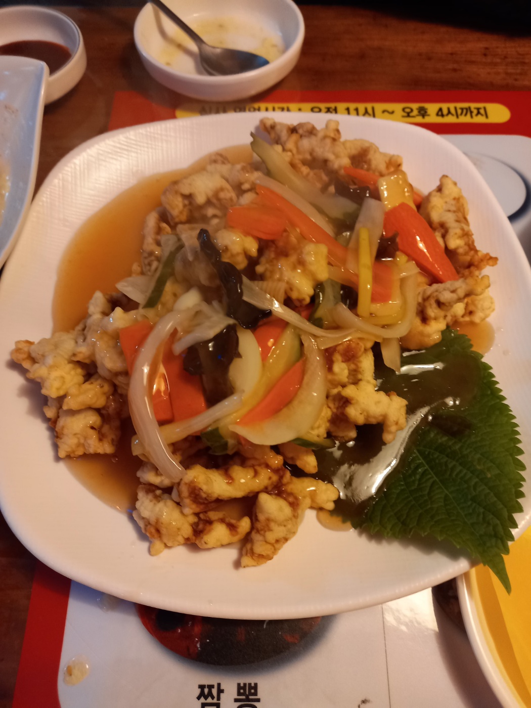 특이하게도 깻잎이 하나 나왔는데, 탕수육을 먹는데 향이 적절히 섞여서 맛이 깔끔하더라구요.