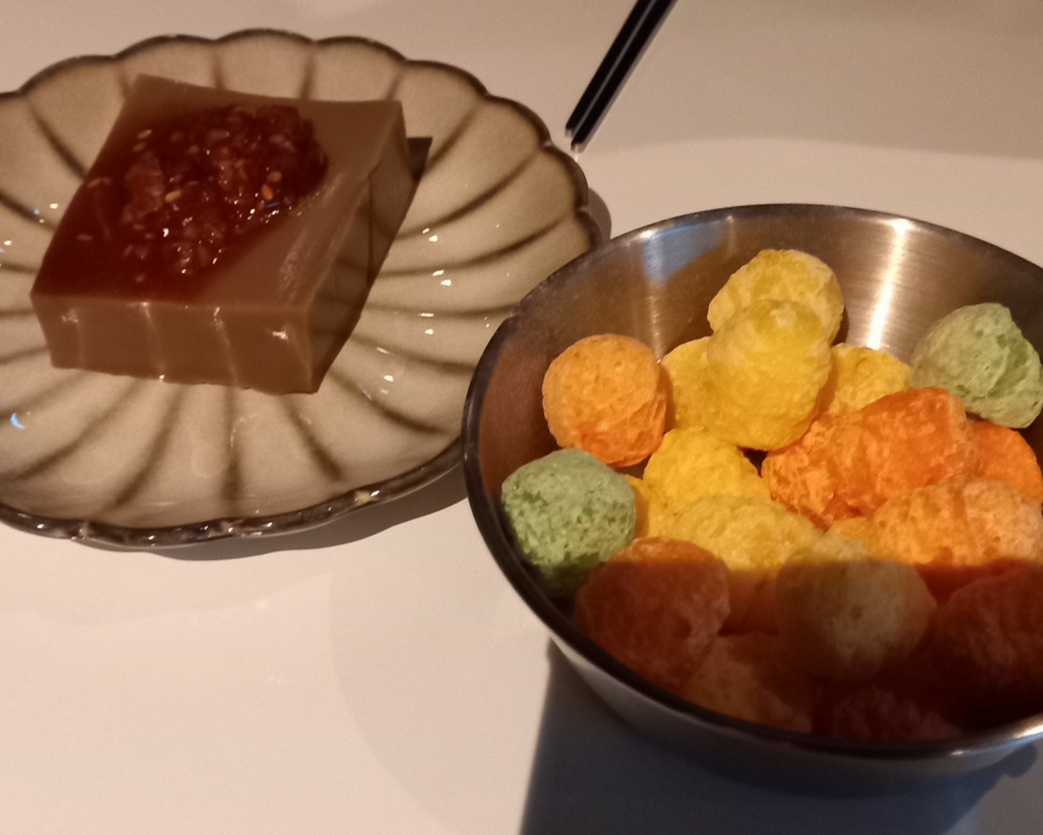 주문을하고 밑반찬으로 도토리묵과 과자가 나옵니다.