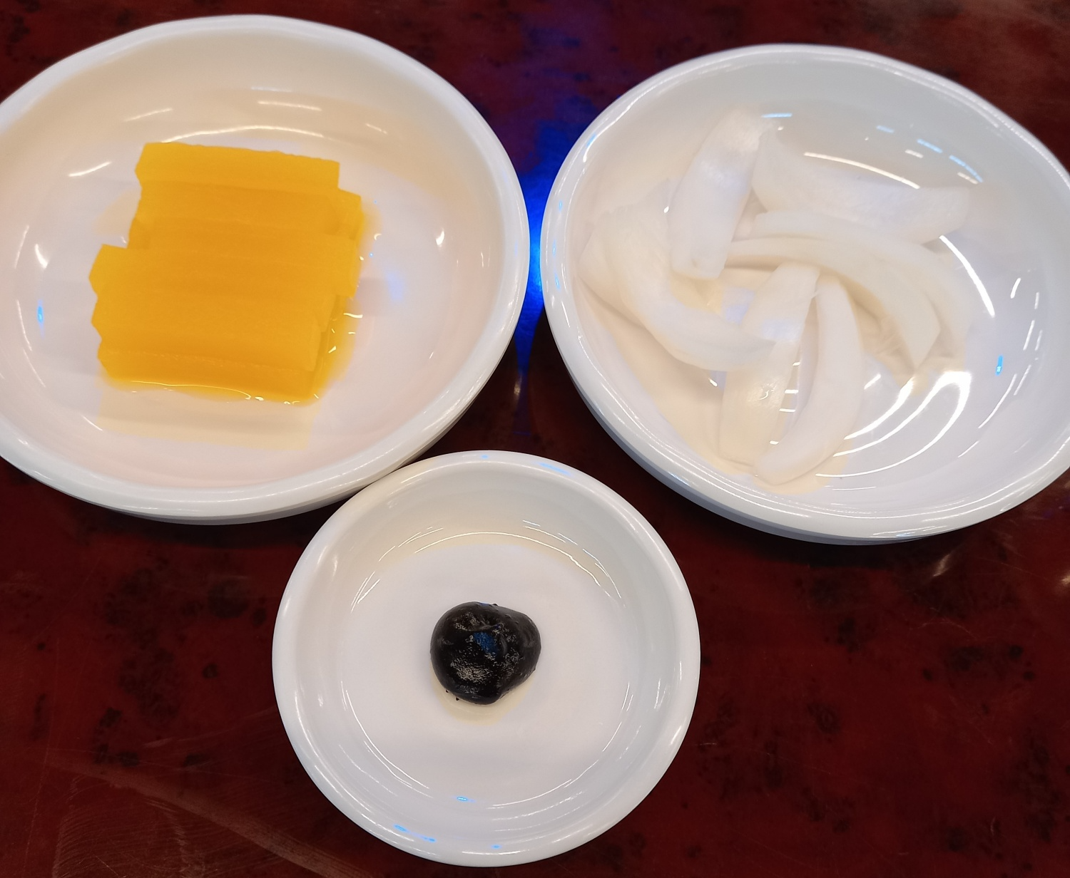 밑반찬으로 단무지 양파 춘장소스가 나옵니다.