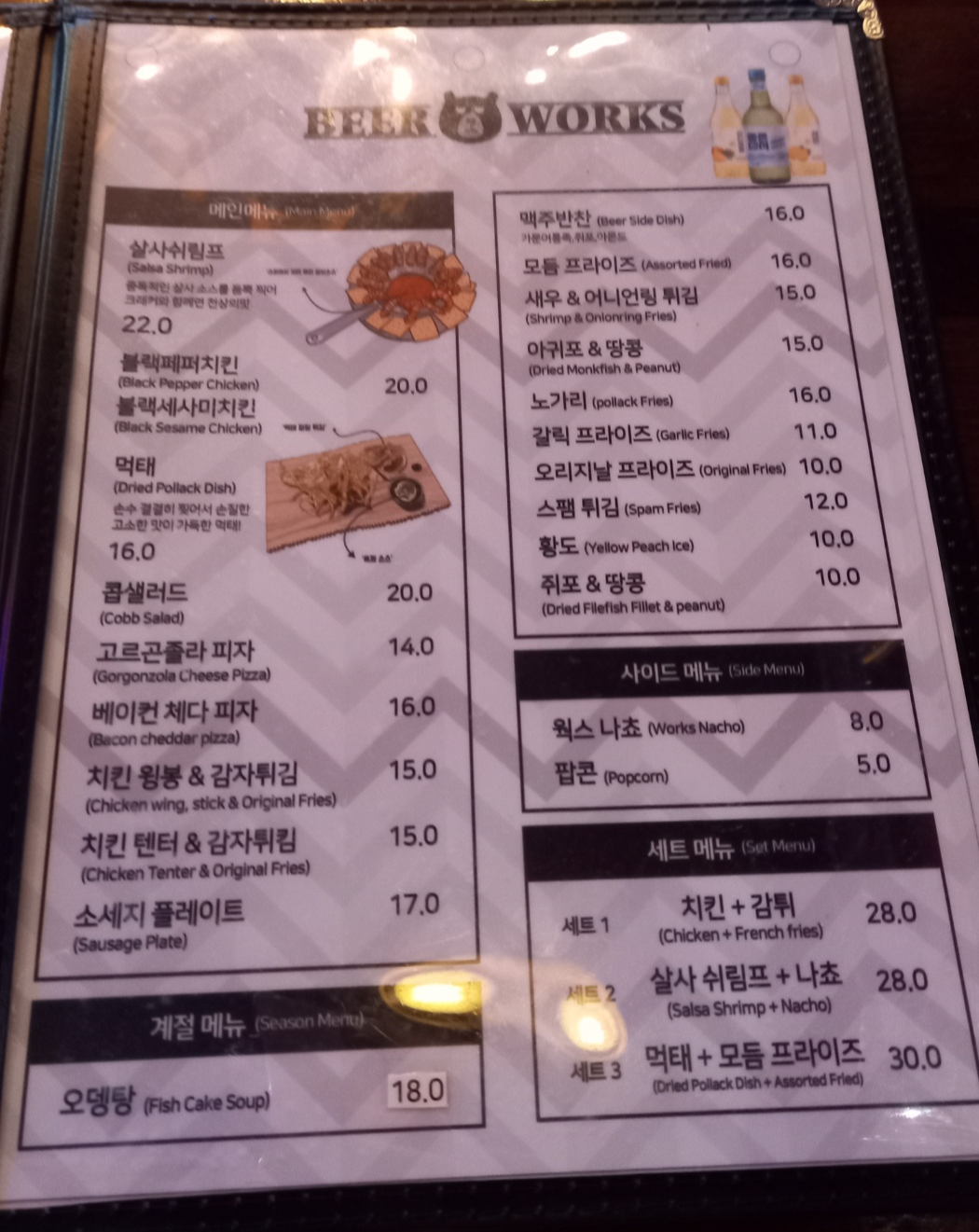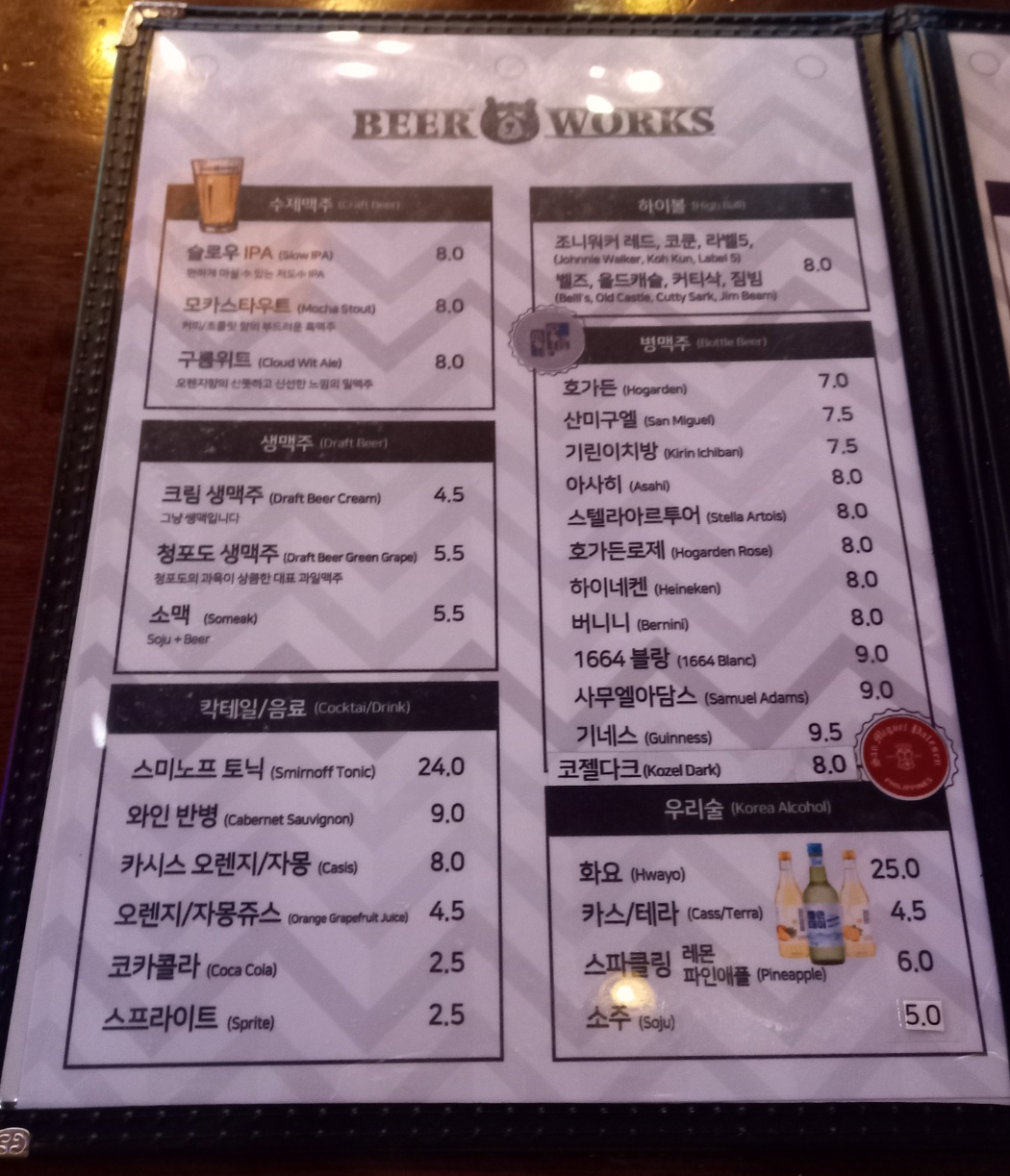 부산 부평동 비어웍스 메뉴판입니다.