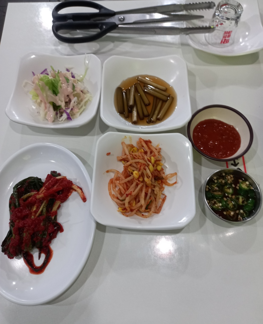 돼지갈비와 어울리는 밑반찬들과 양배추샐러드 편육이 나옵니다.