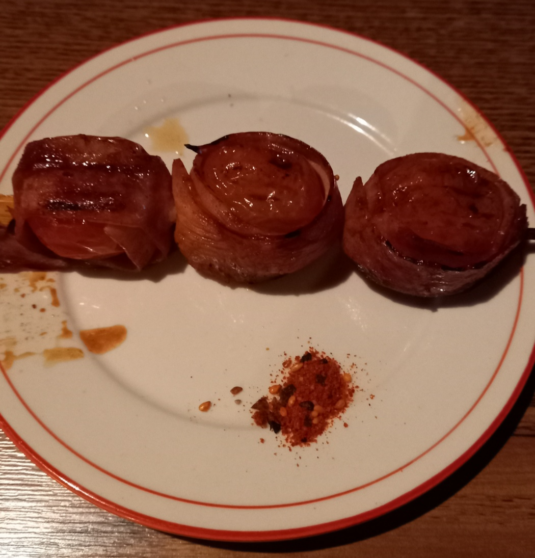 토마토를 구워서 물컹한 식감에 연한 토마토의 맛과 베이컨의 짭짤하고 담백한맛이 좋아요.