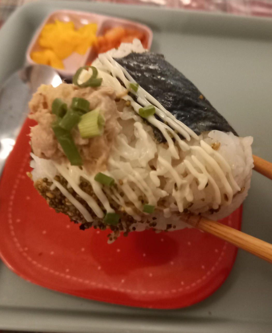 주먹밥 밑간이 잘 되어져 있고 참치와 몇가지 재료가 더해져서 맛있었습니다.