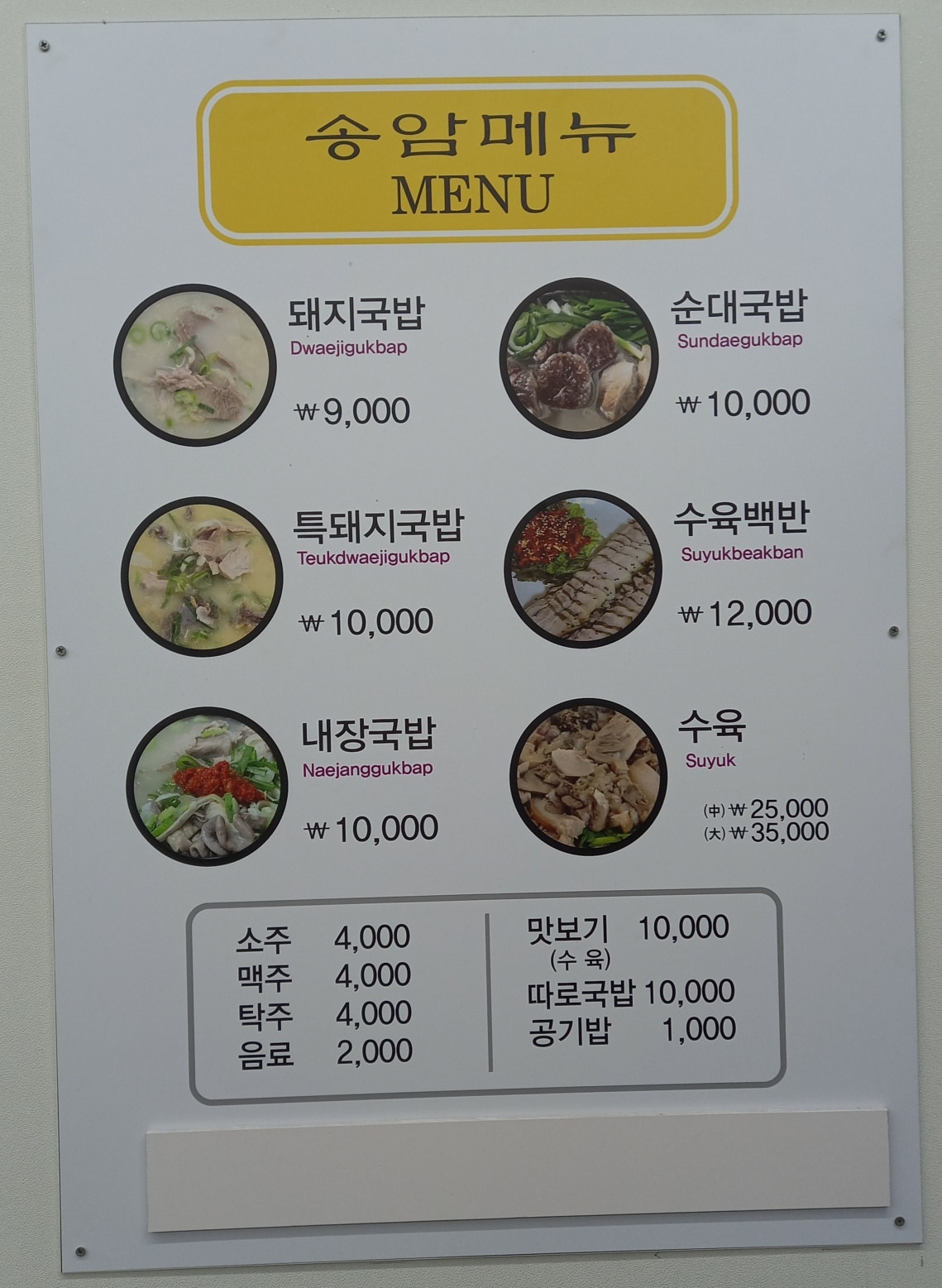 돼지국밥 순대국밥 수육백반 섞어국밥등 몇가지 국밥 메뉴들을 판매합니다.
