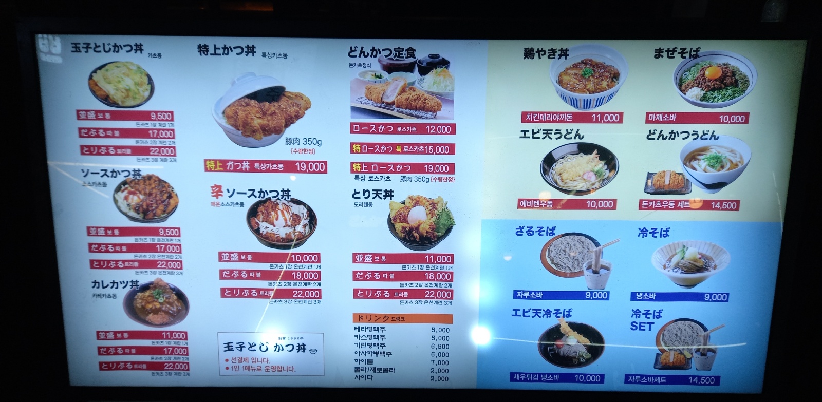 돈까스덮밥인 카츠동을 메인메뉴로 판매하고 우동 소바등 몇가지 메뉴를 판매합니다.