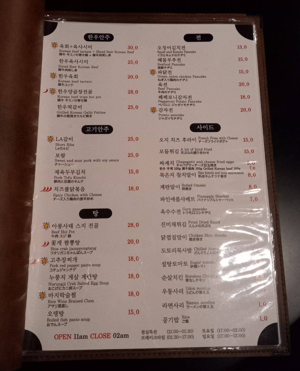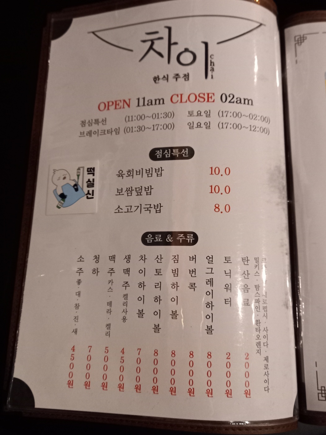 영업시간 : 월요일 ~ 금요일 11:00 - 02:00, 토요일 ~ 일요일 17:00 - 02:00.