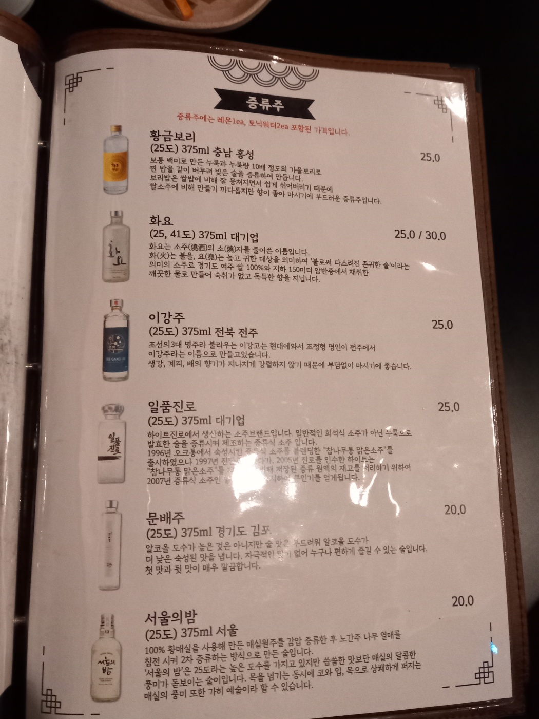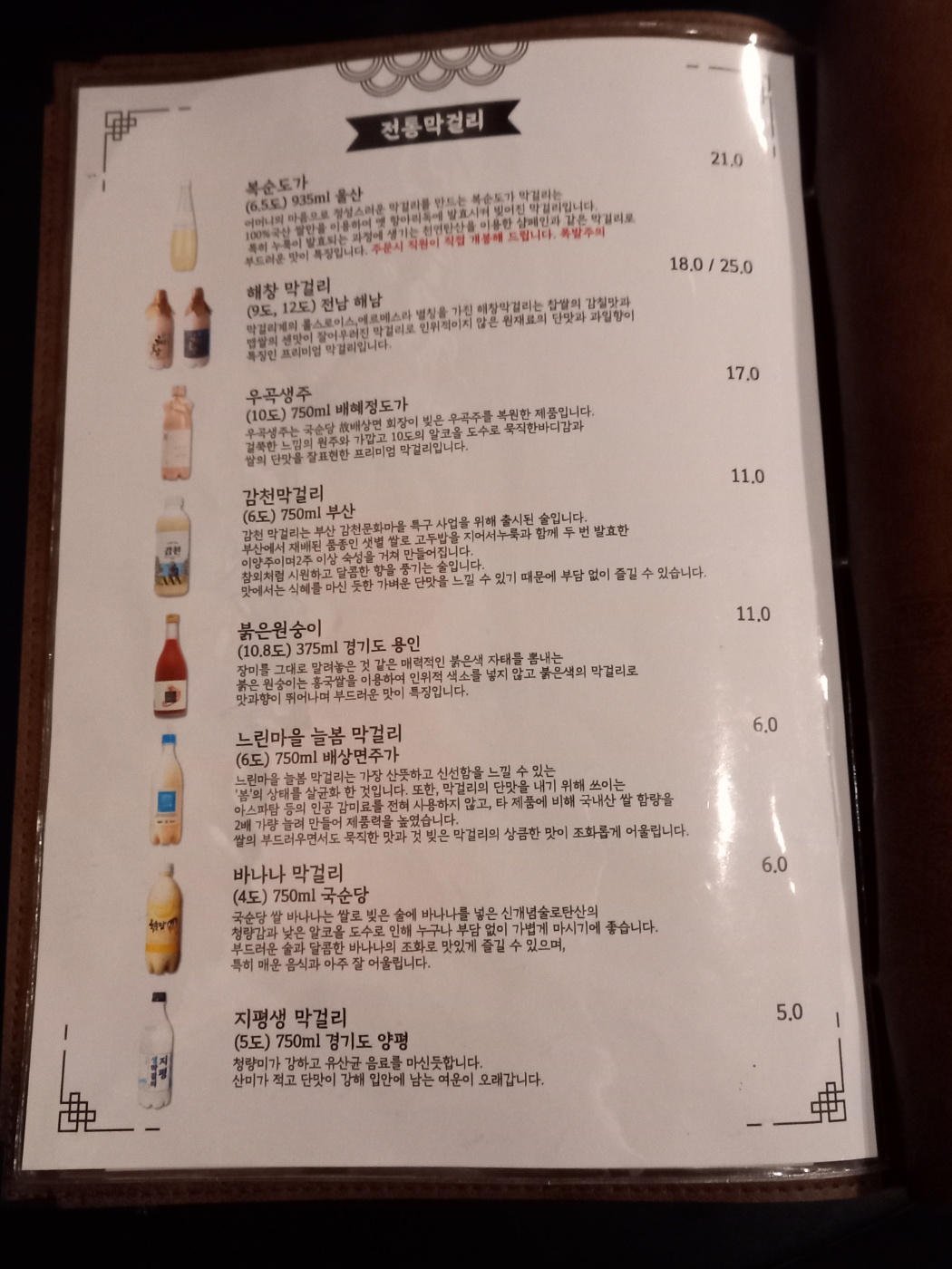 여러가지 한식 메뉴들을 판매하고 막걸리 증류주를 판매합니다.