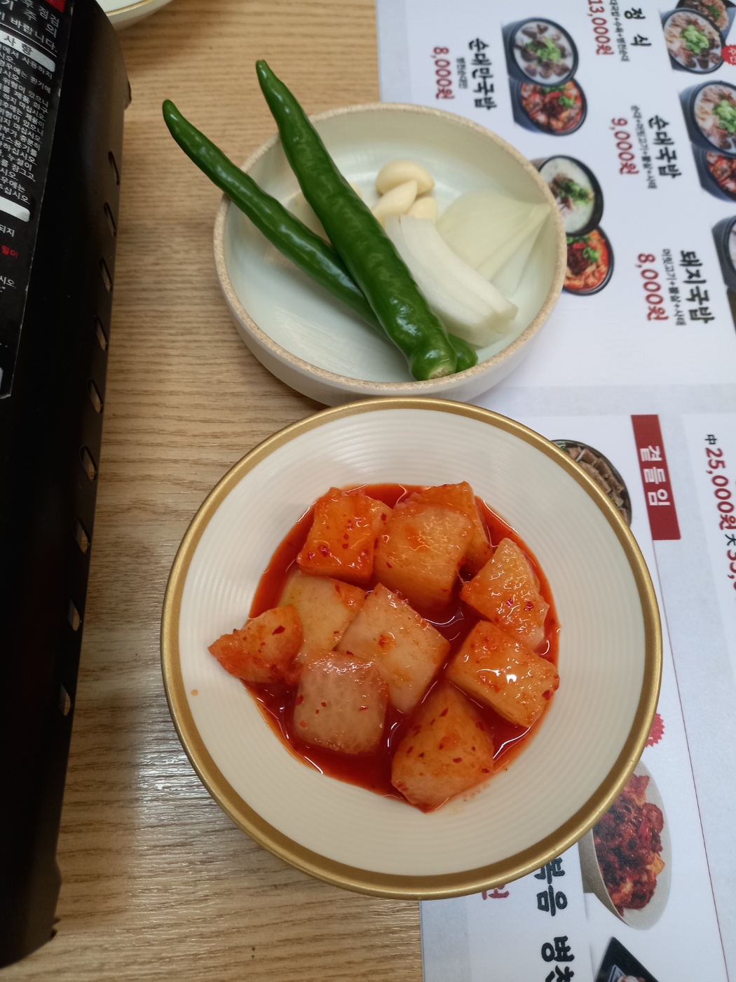 반찬은 깍두기 김치 양파 마늘 고추가 나옵니다.