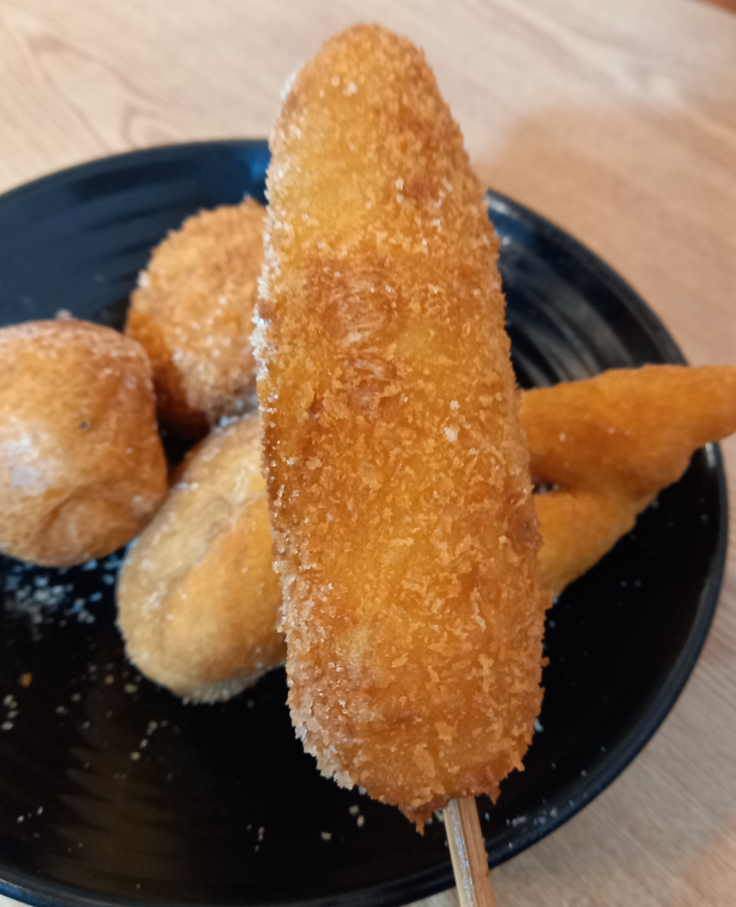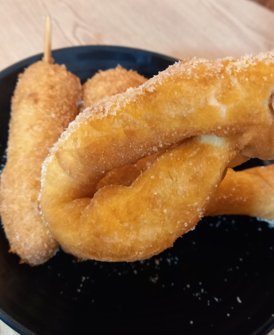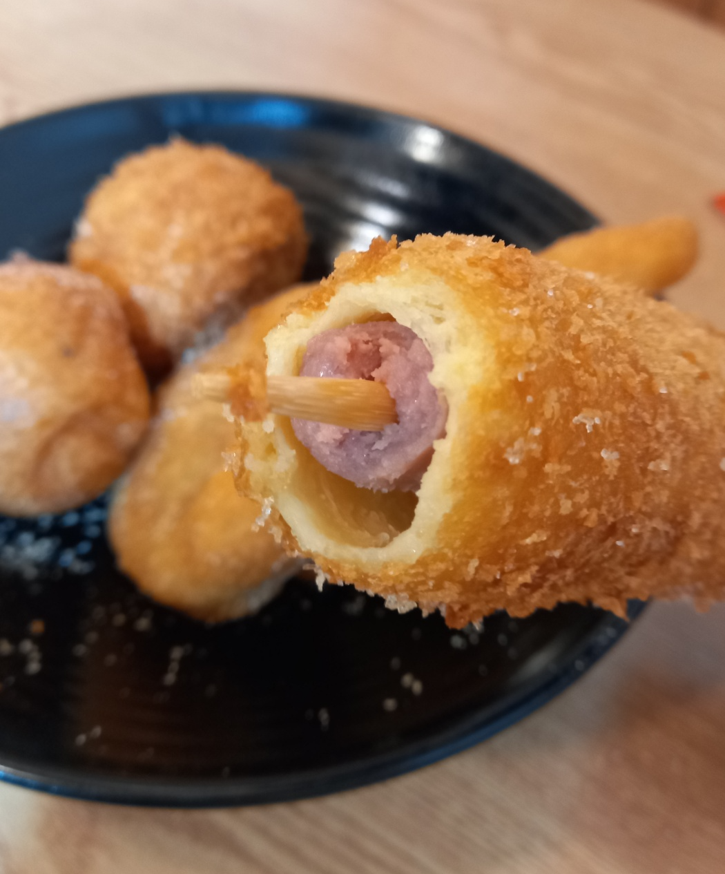 바삭하고 속은 촉촉하면서 소세지가 들어있는데 일반 핫도그보다 더 맛있습니다.