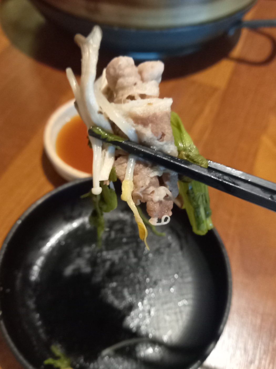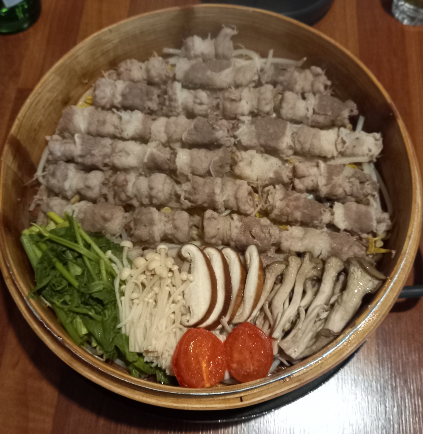팽이버섯 느타리버섯 표고버섯 콩나물 미나리가 나와서 고기와 같이 드시면 더욱 맛있습니다.