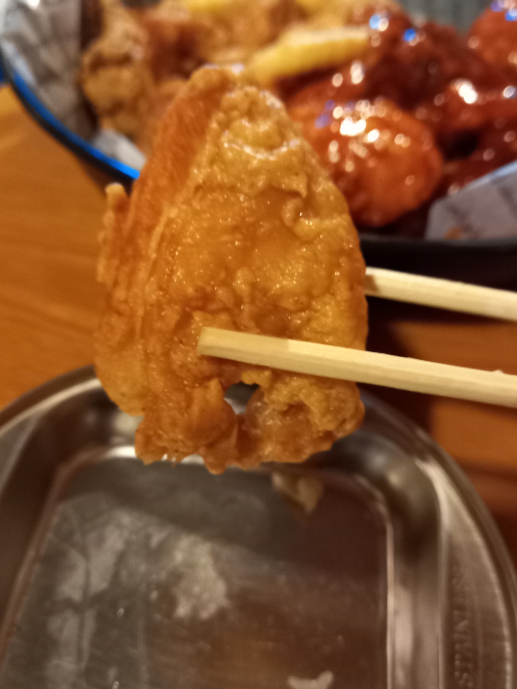 치킨의 튀김옷이 얇고 바삭한 식감과 속이 촉촉한게 겉바속촉의 치킨입니다.
