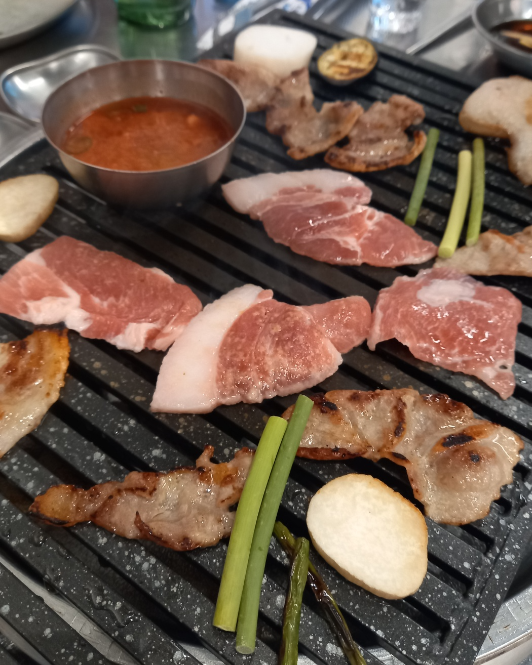 불판이 중앙이쎄서 익은 고기는 외곽쪽으로 빼고 새로 올려서 구워드시면됩니다.