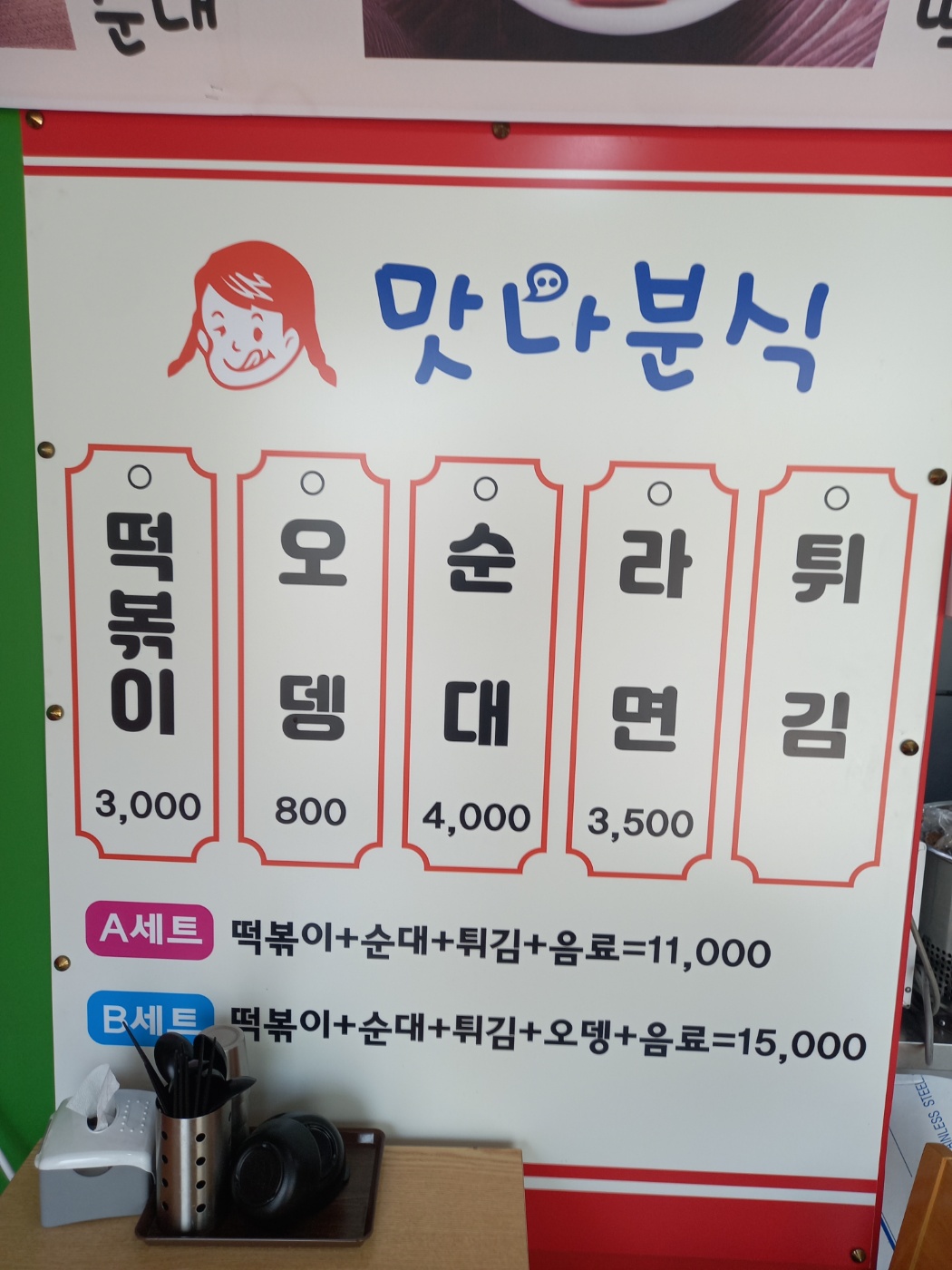떡볶이 오뎅 순대 라면 튀김등 여러가지 분식 메뉴를 판매합니다.