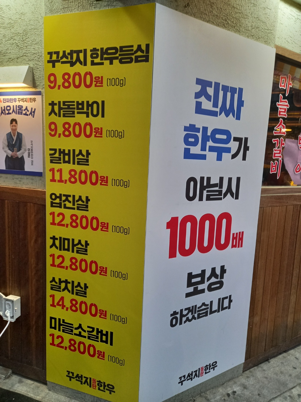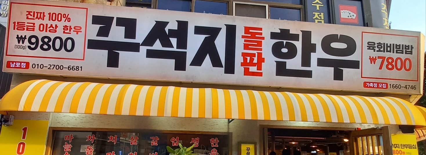 남포동 꾸석지돌판한우 메뉴판입니다.