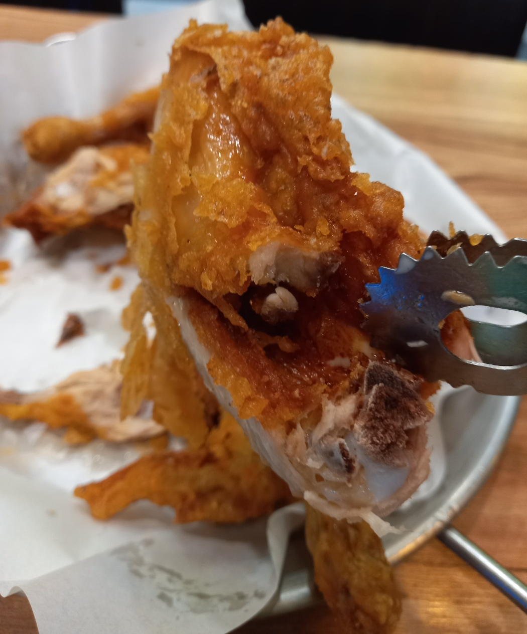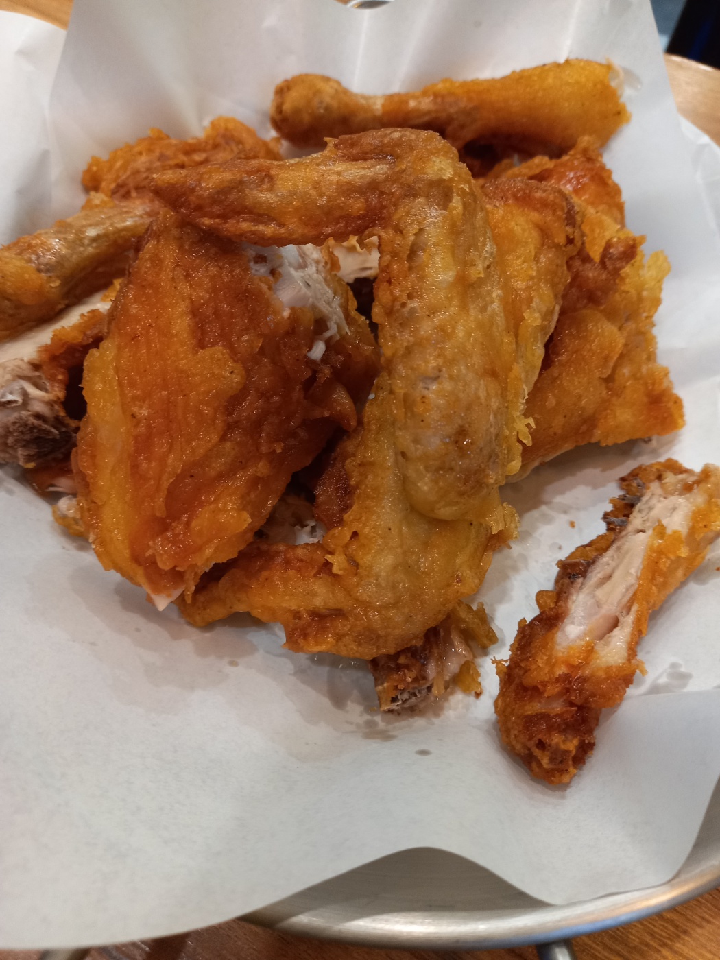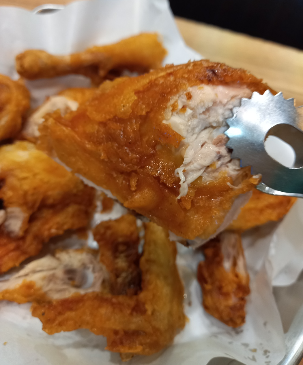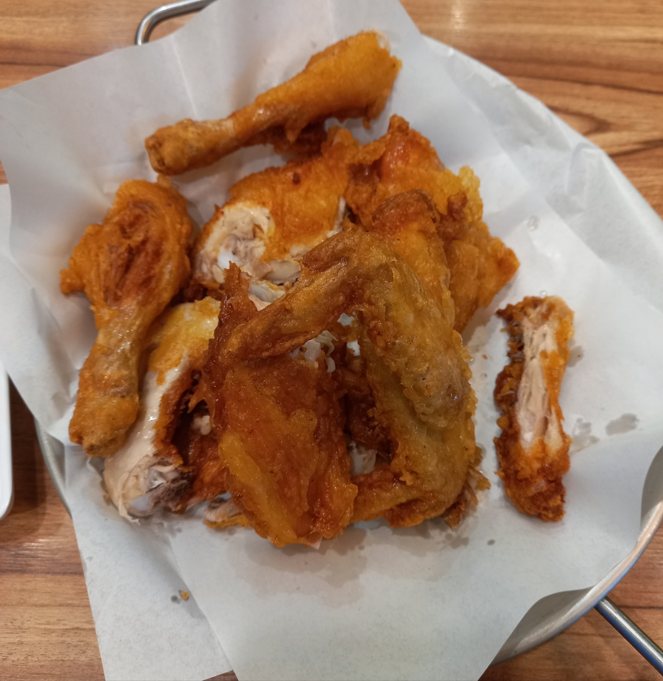 튀김옷이 얇은 옛날통닭인데 겉은 매우 바삭합니다.