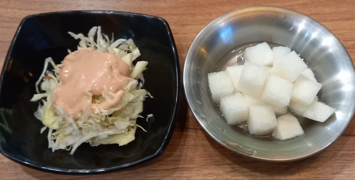 밑반찬은 양배추샐러드와 치킨무가 나옵니다.