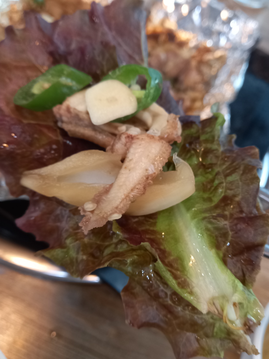 담백하고 고소한 꼼장어에 알싸한 마늘과 고추 짭짤한 양파절임을 올려 먹습니다.