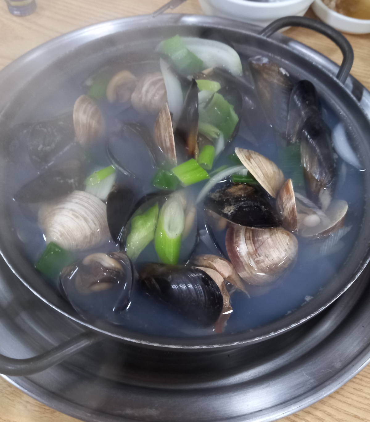 큰 홍합과 백합이 푸짐하게 들어간 조개탕입니다.