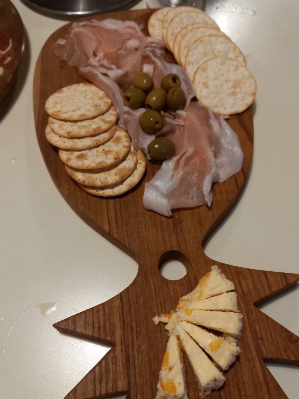 크래커에 사퀴테리와 치즈 올리브를 올려서 먹었습니다.