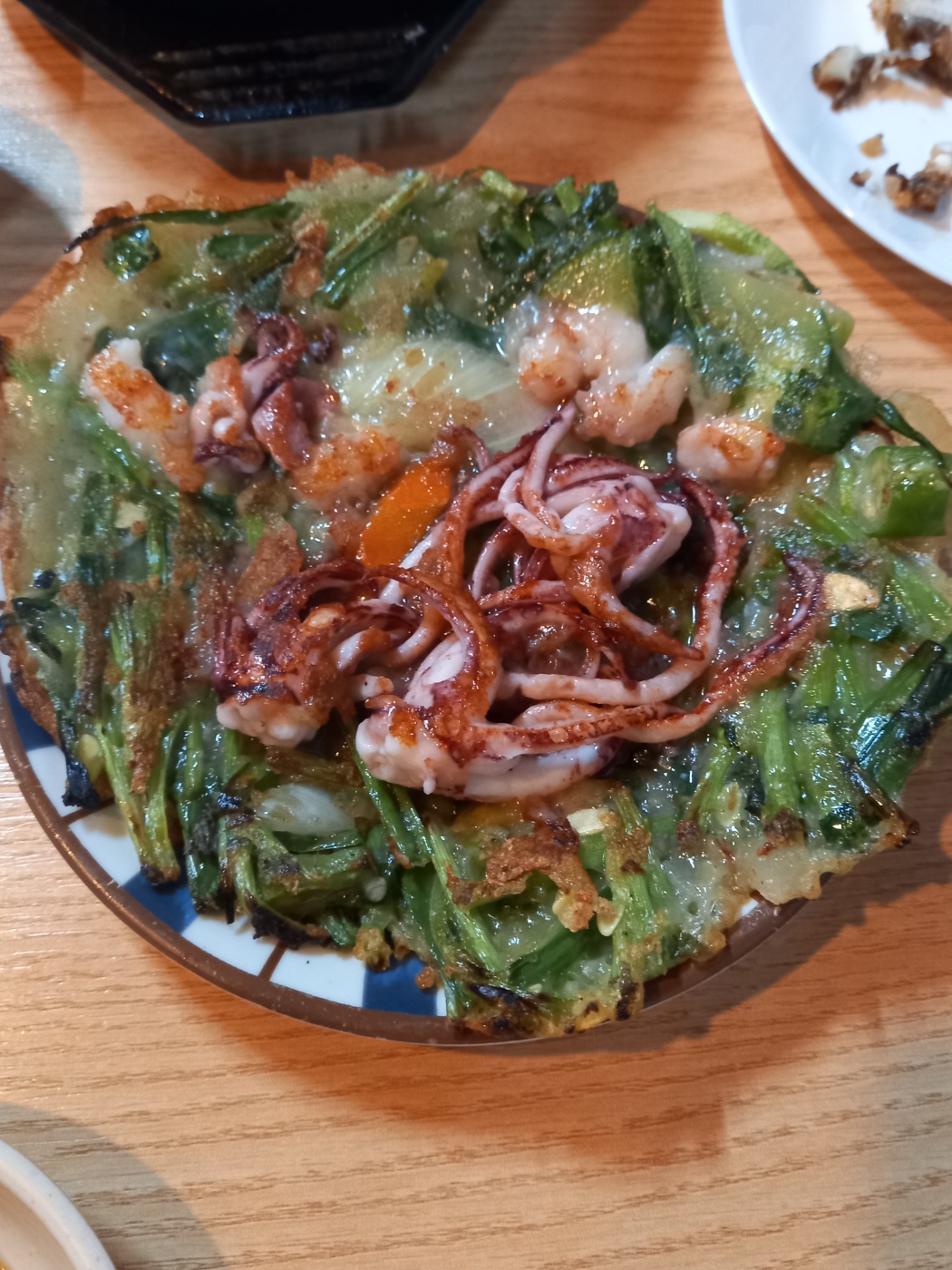 고소한 파전에 오징어를 크게 넣고 만드셔서 오징어의 짭짤한 맛까지 더해져 맛있습니다.