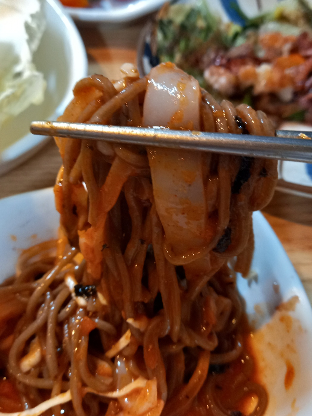 고소한 비빔막국수에 짭짤한 한치가 푸짐하게 들어가 매우 맛있습니다.
