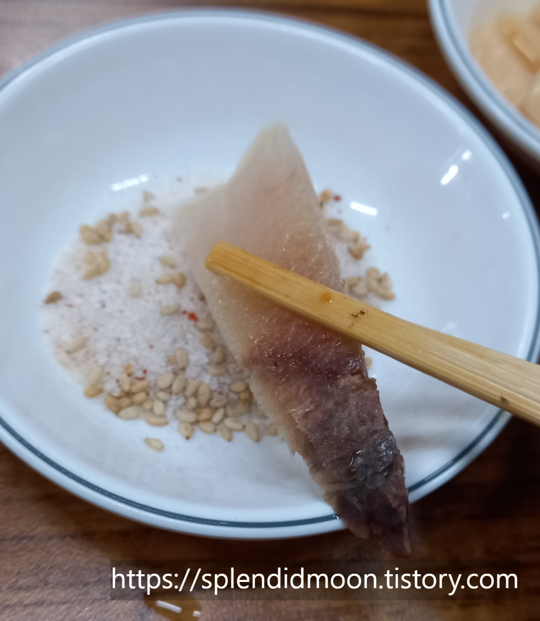 소금에도 찍어먹어봤는데 양념장이 훨씬 맛있습니다.