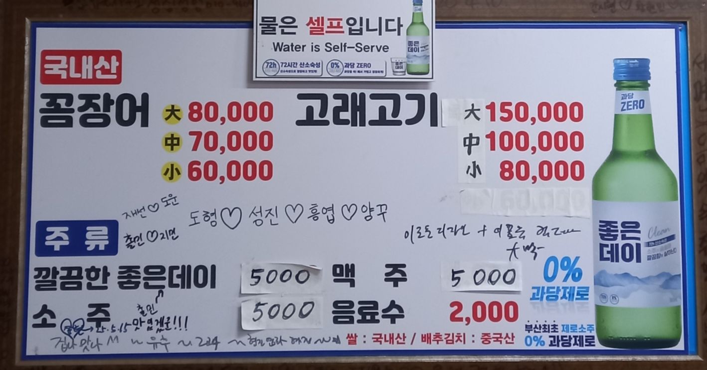 자갈치시장 고래고기 남포동 고래1번지 메뉴판입니다.