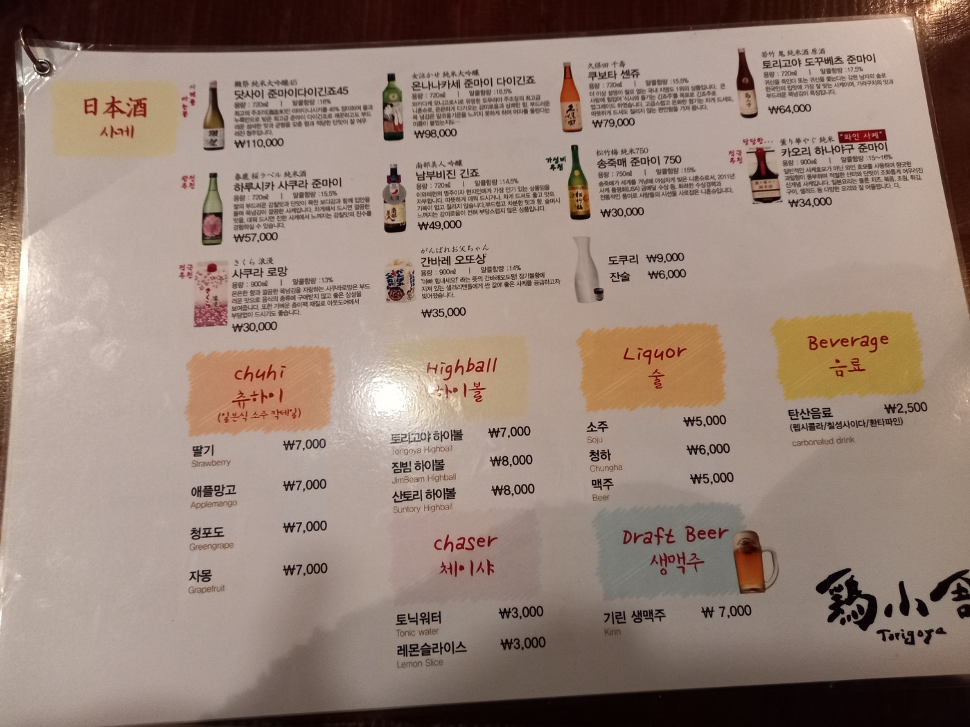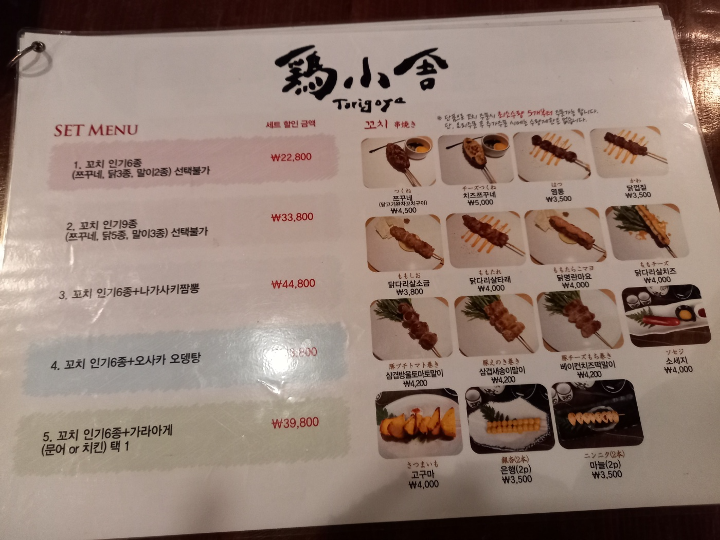 토리고야 메뉴판입니다.