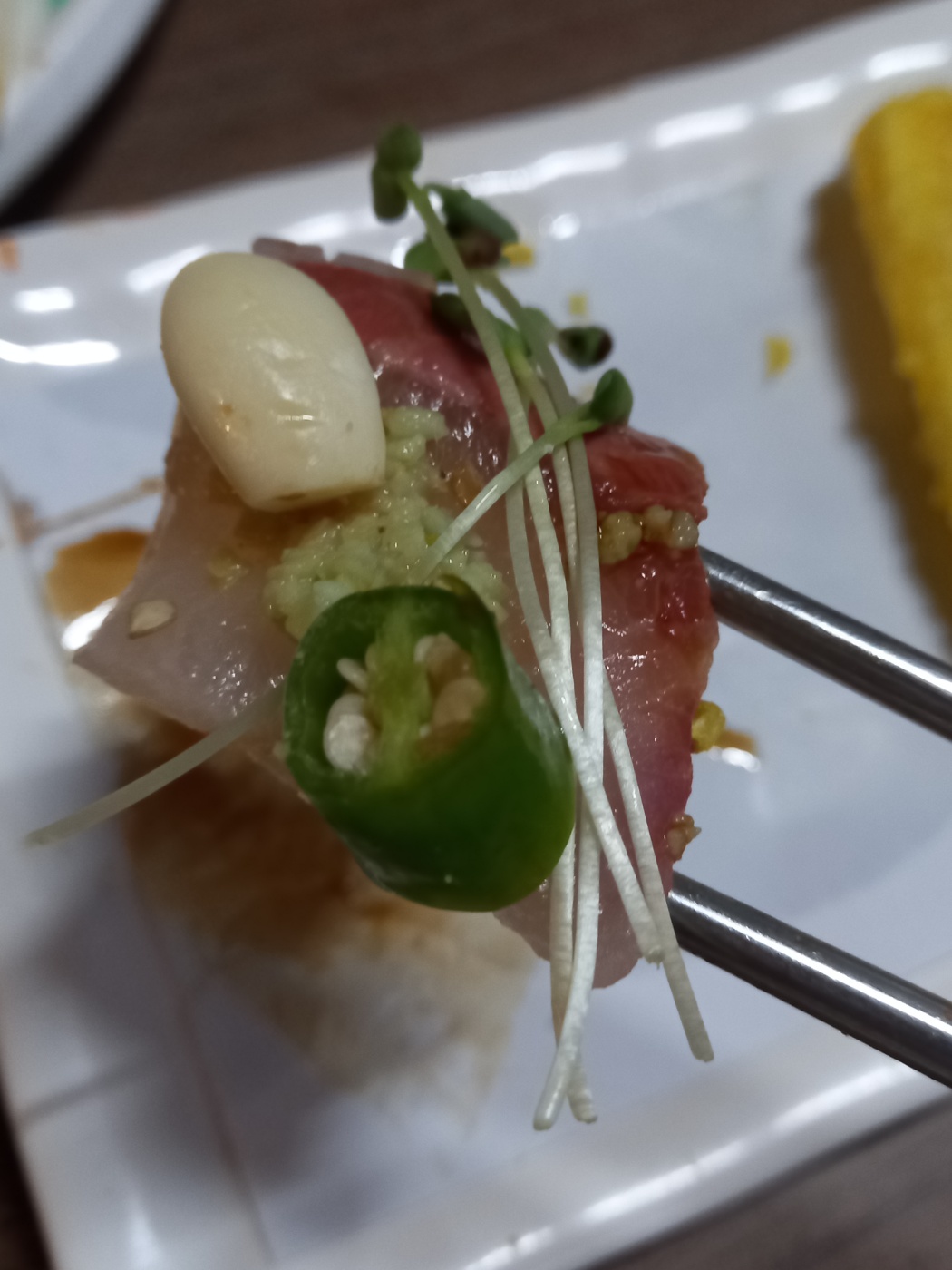 거기에 와사비와 마늘 고추등을 같이 먹으니 알싸하니 더 맛있네요.