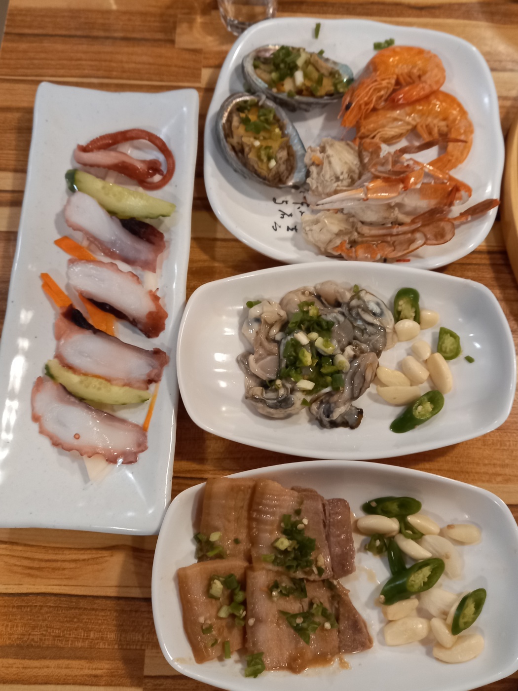 문어숙회 생굴 전복구이 새우 수육이 나왔습니다.