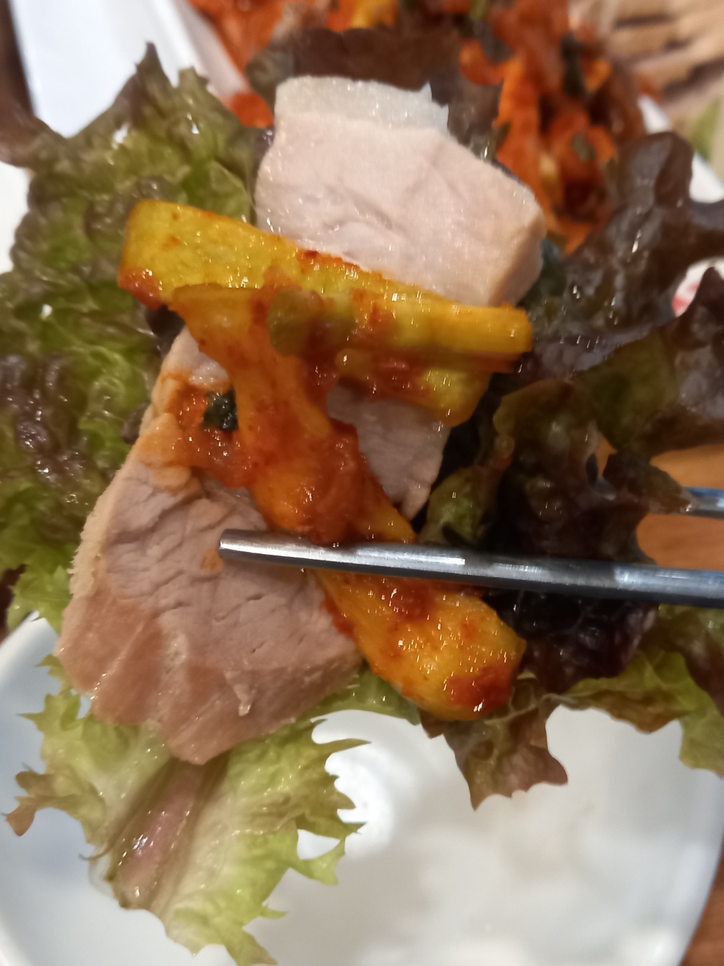 싱싱한 상추와 상큼한 무말랭이 담백한 보쌈!! 삼위일체의 궁극의 맛이지요.